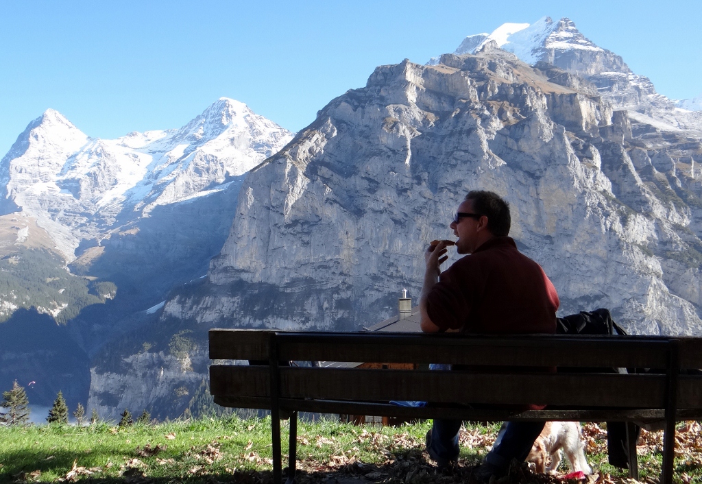 Reaching Mürren (another great tip from Joseph) we wandered through the town before finding a bench with a view for a picnic we’d brought with us. I could stare at those mountains all day and never get bored. Tiny red trains ran up to the bottom of the Eiger before plunging into the tunnel through the mountains to the Jungfraujoch – the highest train station in Europe. I’d been around here before on a school trip, but have to admit once again to not remembering much about the place. I’m pretty sure we went up to the Jungfraujoch and the Shilthorn (from the James Bond movie ‘On Her Majesties Secret Service’) but I was convinced the Shilthorn was on top of the Jungfrau – it’s all very confusing, probably due to too much Swiss chocolate!