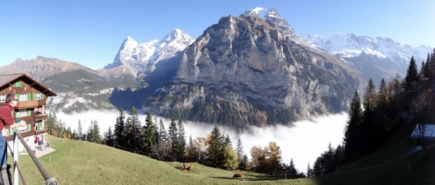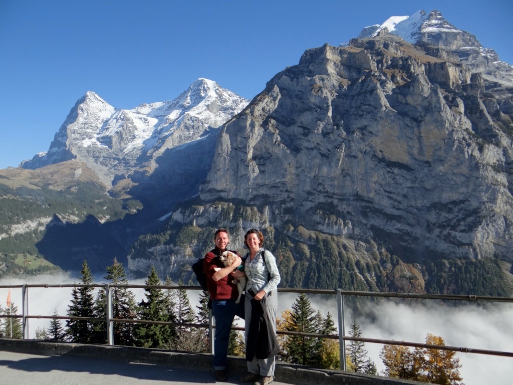 Reaching the gondola we paid 10.40CHF each for a one way ticket then jumped on board and made our way up to Gimmelwald. There were only around 20 people in the gondola but with iPads and cameras filling most of the window space and a whimpering pooch to contend with we didn’t see much of the view. We did however hear a collective ‘ooooh’ signalling we’d broken through the cloud. Peering through the people we could see blue sky and white mountain tops, enough to make anyone happy – apart from Charlie. At the top I stopped to take some photos of the view before realising that most people had gone onto another gondola – we were only half way there, poor Charlie.