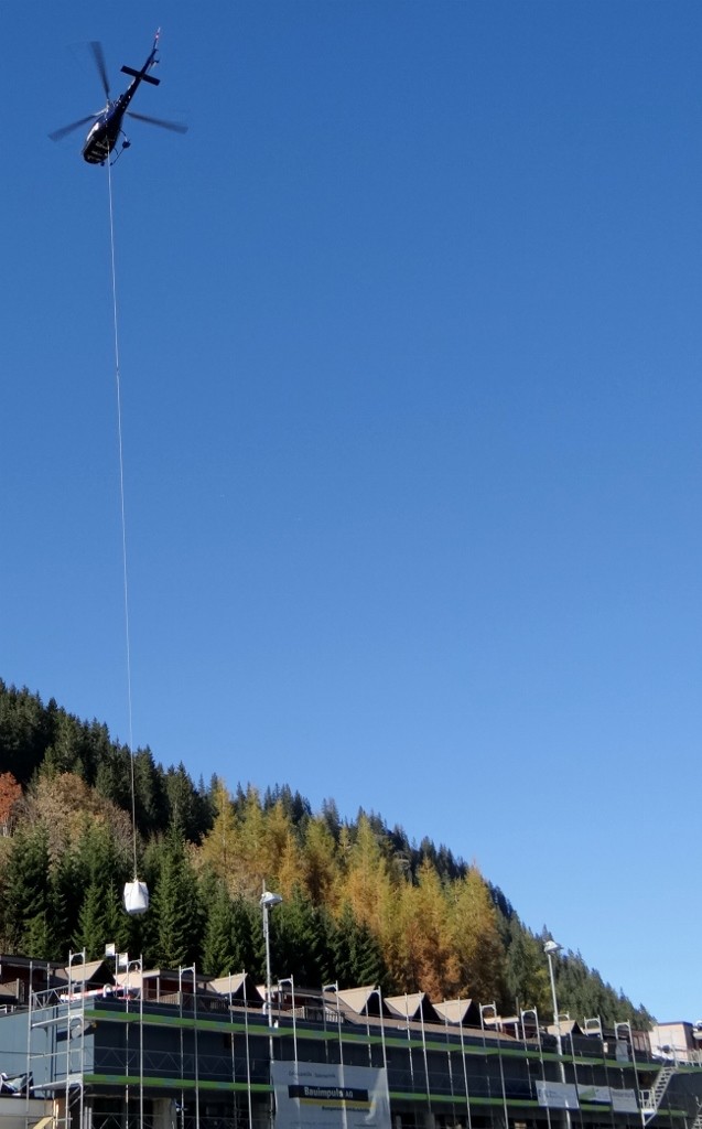 The men in orange were already there hooking up bags of building materials to the rope hanging from the helicopter so they could be moved across the site. I’m sure a crane would have been much cheaper but with the railway to here being repaired I guess it wasn’t possible.