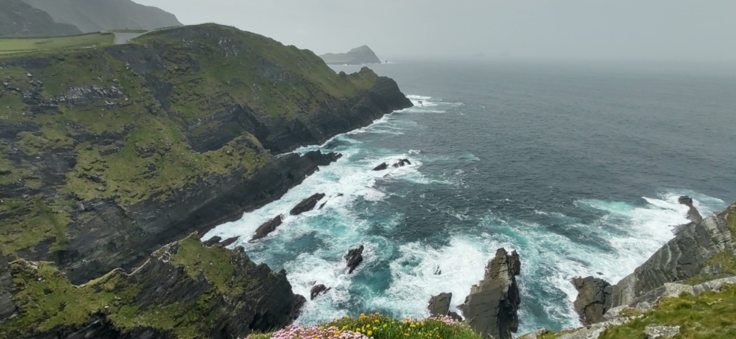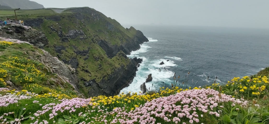 Dark gray slate cliffs plunged into foaming white spray surrounded by azure blue waters. Clinging to the cliff faces kittiwakes and fulmar perched precariously on their nests. The cliff tops were carpeted with lush green grass, dotted with tiny pink flowers. A path took you up to a couple of view points on the tops of the cliffs, looking out across the ocean to the Skellig Islands, which were sadly just an outline in the mist.