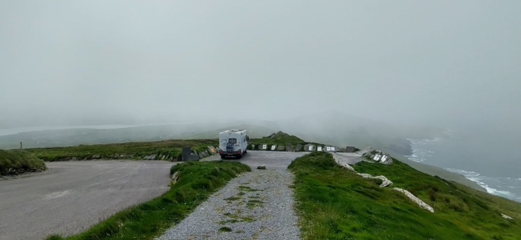 Yesterday evening the wind dropped and the clouds around us lifted a little. Sadly clouds leave everything a little flat and grey, but now we could now see down to Valentia harbour and the islands at its entrance. Two other vans joined us for a very peaceful night. When we awoke in the morning the could was so thick we could hardly see them, let alone the view.