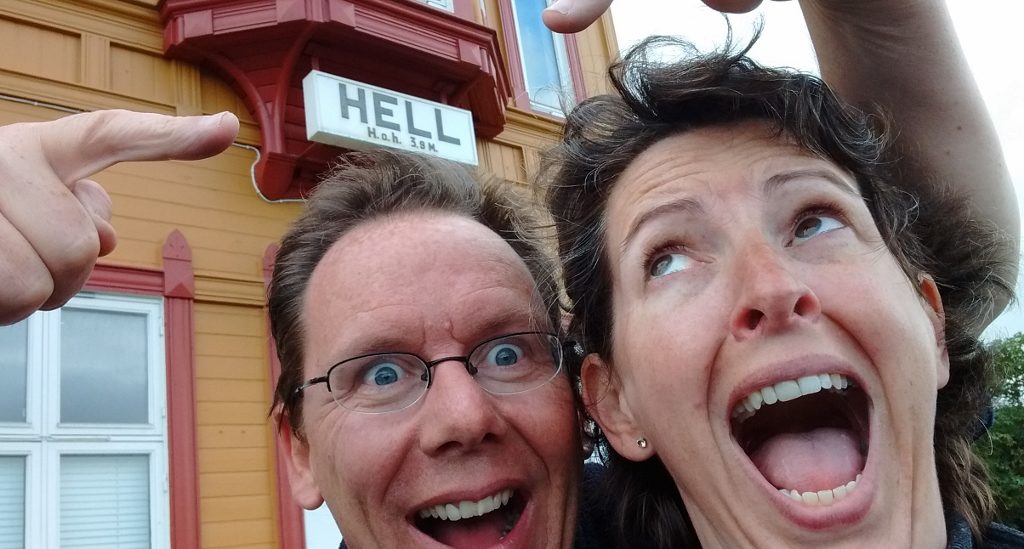 Today we ate up another 3 hours, nipping to Hell on the way into Trondheim. Yes folks, given the opportunity to visit Hell, who’d pass it up? In we went, first heading for a shopping centre in Hell, then nipping to the train station for a few photos fooling about in front of the town’s name (which means ‘prosperity’ in Norwegian).