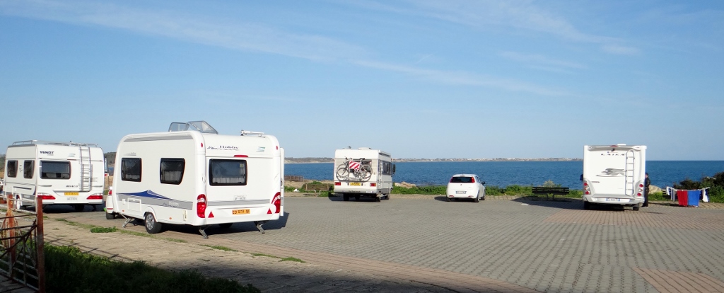 Dave the motorhome’s windscreen has a stunning view out of it, over the blue waters of the Ionian sea (N38.90964 E17.02658). To our left are pleasure boats in their berths waiting for the summer, to our right the breakwater wall of the harbour shelters more frequently used fishing boats.