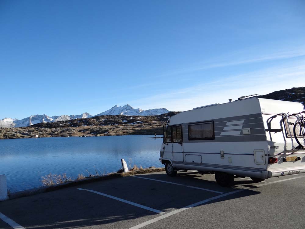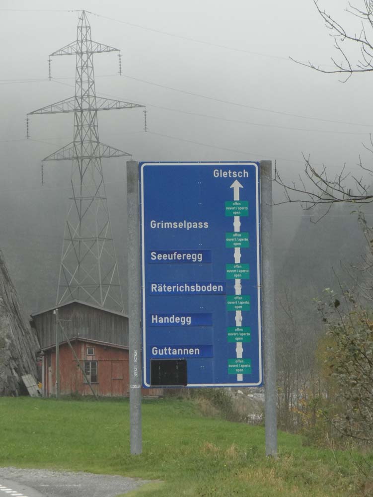 Dave the motorhome is free camping at 2165m at the top of the Grimsel Pass, Switzerland (N46.56141 E8.33768). The view from our front window is spectacular. The sign says 10 CHF (about £6.50) a night for a motorhome to stay here, but the buildings are all boarded up for winter and no-one’s been to ask for the cash.