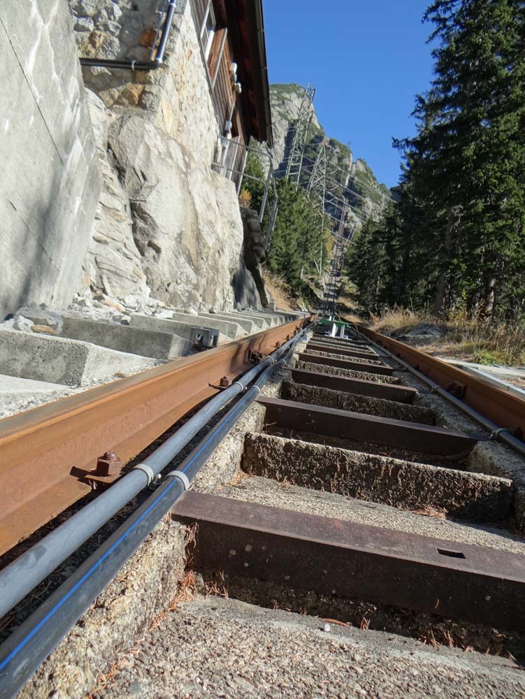 Gelmerseebahn. We had it written on a scrap of paper along with GPS co-ordinates. Joseph and Petra had emphatically suggested we visit, so we’d programmed it in as it lay on our route to the Grimselpass. A few years ago, Switzerland realised the many funicular railways it had built for the purpose of moving materials for constructing dams and the like could be converted into tourist attractions. The one at Gelmersee happened to be the steepest in Europe, and as we arrived to peer up at it from below, we felt ill at the sight.