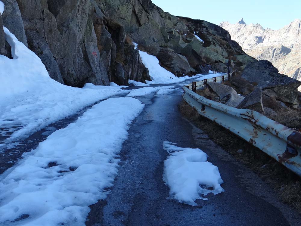 As we walked back down the crazy road, eyeballing the many bent-metal barriers and trying to stay upright on the ice while staring at the view, Swiss fighter jets played around in the sky popping out sonic booms and scaring the be-jeezus out of us. A couple of helicopters touched down in the pass car parks, one military and another doing the now-expected job of fetching some kit from elsewhere via a long rope slung beneath.