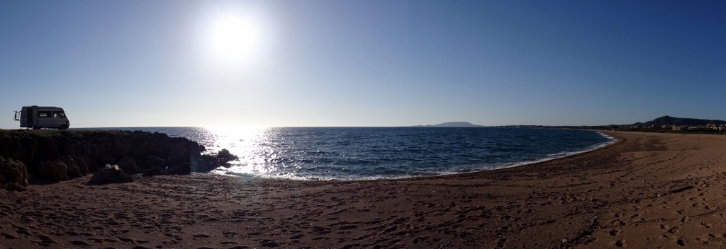 Dave the motorhome is sitting on a rocky promontory in Romanos looking out to sea (N36.98967 E21.64905). The view of the curve of golden sand from his windscreen is almost perfect, a leisure hotel complex the only blight, but even that is in tasteful sand coloured brick.