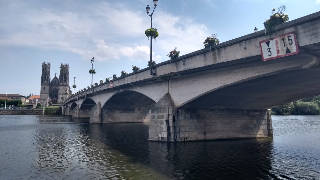 Zagan the motorhome’s on a flight path north, skipping from aire to aire through the rolling hills and neat vineyards of the Jura and across the edge of the low Vosges mountains. We’re currently in a lovely aire at Pont-à-Mousson. Out of the side windows we’ve a view of yachts, broad Dutch barges and speedboats in the town’s port de palisance, the marina, on the Moselle river (N48.901175, E6.063451). A short rain shower earlier on has petered out, and very welcome it was after a few days of 30+ degrees.