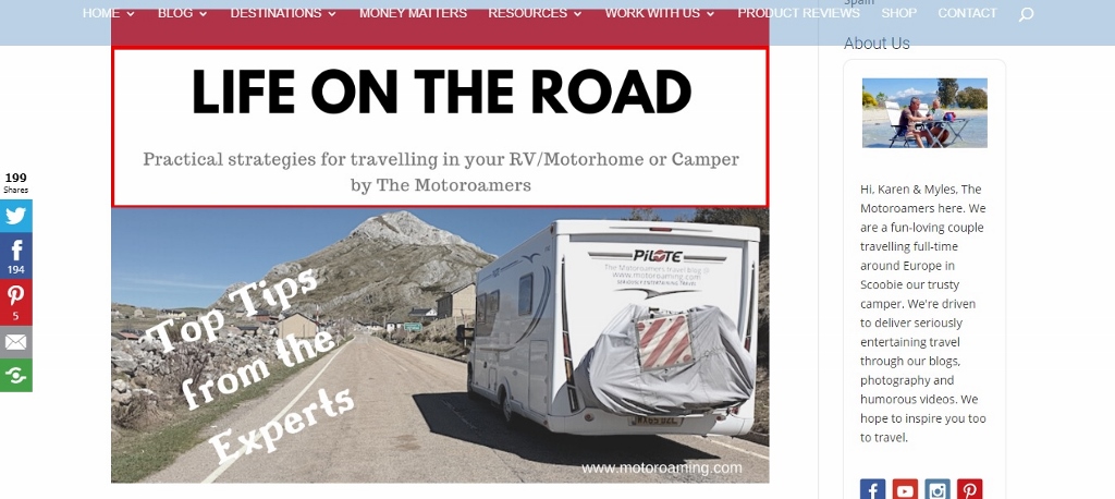 Finally we’ve written a few pieces for other blogs. The first of which has just been published on motoroaming.com. Multi-year full-timers and prolific bloggers Karen and Myles (the motoroamers) have pulled together a great resource giving top tips from several other bloggers for life on the road. I’m not sure we class as experts, but it was really nice to be asked to contribute.