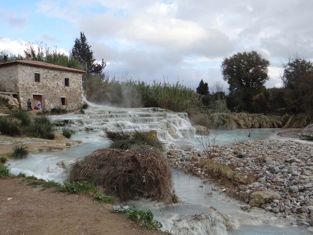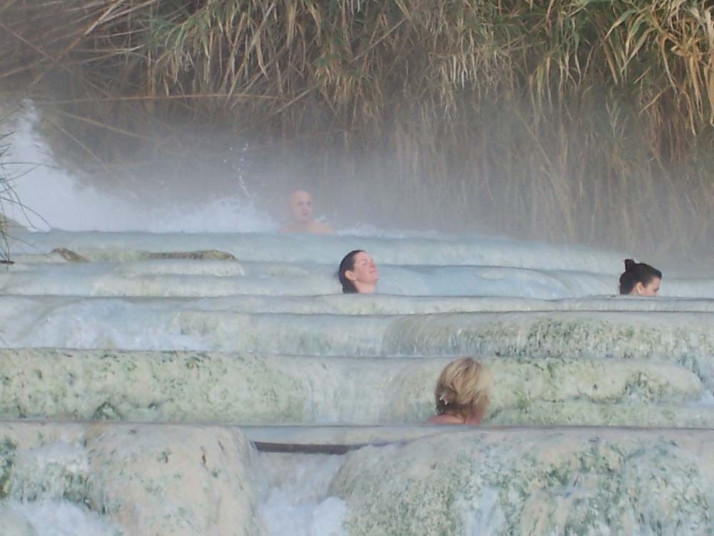 Next stop: here. I’ve been looking forward to this place since Frances Mayes wrote of it in Under the Tuscan Sun as “In the morning, I have one of the favorite experiences of my life”. Ooh, come on, that’s gotta be good hasn’t it? Sure enough, it’s pretty cool. Just 30 meters from Dave, with none of the €22 entrance fee of the spa up the road, the 37 degrees milky blue water of a thermal river tumbles out the side of the hill into a cascade of mini infinity pools. Each is seemingly the perfect size for a couple of people to wallow in, the water spilling over you. Ju suspected one of the Italian couples was getting a little too carried away, and we averted out eyes, we’re British, don’t you know. Should you venture here, and I’d seriously recommend it, be prepared for looking a little foolish as you move from pool to pool. The Italians seem to float over the fat tufa lip of each of them, while we kind of stumbled about, my inept stagger not helped by my forgetting to pop in the old contacts, my glasses were well steamed up!