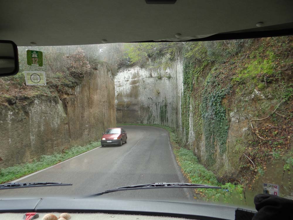 We pulled out of our cat-stalked camping spot, down the hillside and immediately into a high-sided U-shape chopped into the tufa. The hills around Sorano are steep and soft, and some energised soul had managed to create a road out of a cliff by simply delving into it until it was flat enough to drive. The modern-day road builders weren’t the first to pull this trick though, as we found out a few minutes later.