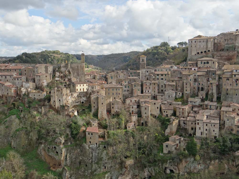 Thankful that fate saw to it the petrol tanker in town wasn’t on the road at the same time as us, we drove a kilometre or two, crossing a bridge over the ravine before pulling over for a short hike to a viewpoint, passing a few Etruscan tombs, man-high holes hacked into the rock, the pre-Christ tool marks clear to see.
