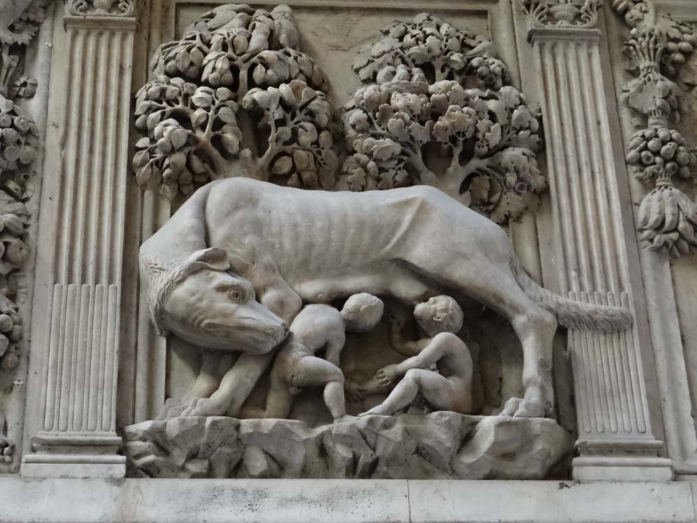Seen everywhere in Siena: the legend of a she-wolf feeding infants Remus and Romulus. Senius, son of Remus, founded Siena. Romulus founded Rome.