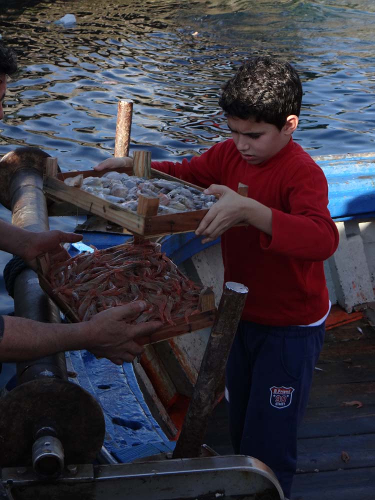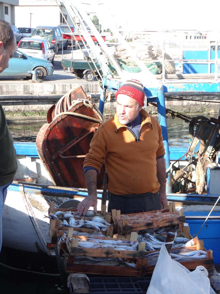 Back in the real world, the one we can actually see, it’s alive around the dock where the fishing boats reverse to a thick crowd of dark-coated men milling about in anticipation. Not just alive with folks either (see below). We spent a good while at the docks, watching the unfathomable bargaining process as the fishermen sold directly to anyone buying.