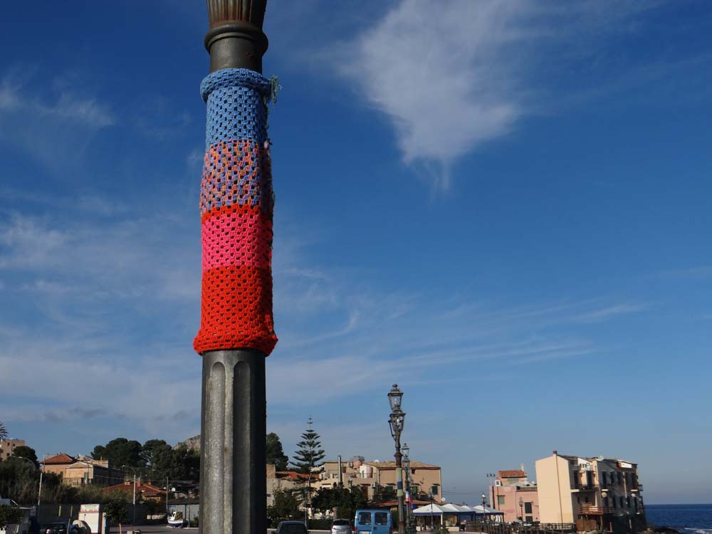 A few lamposts sport these knitted pattened warmers. Unrelated but interesting, people hang their clothes to dry in the street, no apparent fear of jeans snafflers.
