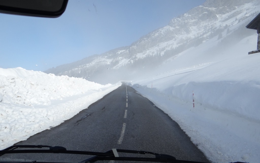 The route for us took us up to the Col des Aravis, a 1486m high pass over the Chaine des Aravis mountains. Passes usually mean switchbacks, and this col was no exception, a twisting grey piste of tarmac slashing through an endless field of snow. Thankfully the road was quiet, giving us chance to appreciate it. Only at about 1475m did we have a minor panic, as the road suddenly went snowbound at the col. Hesitation occurred, followed by a quick smattering of expletives before Ju spotted no-one coming the other way was on chains, so we pulled up, grabbed a photo from the cab and rolled off the snow back onto blacktop.