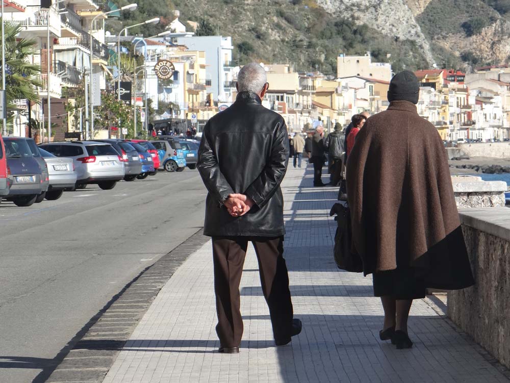 That’s not the only thing giving us away. It’s hot. We set off for a walk around the bay and then up the sheer slope at the end to the Roman-Greek theatre in amongst the clifftop town of Taormina. Both of us were in short sleeves, I even popped on some Factor 30, the sun easily enough to warm us through and to slow-roast our eyeballs, ignoring our sunglasses. One local man we passed was pulling on ski gloves, on another I counted four layers of clothes. Only on the way back did someone speak up, a smiling elderly chap gesturing at our clothless arms: we picked out one word ‘freddo?’ cold?