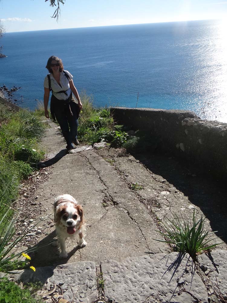 The walk was a decent one for us, as we’re a wee bit lazy, maybe 5 or 6 miles with a good climb in the middle. Running around the edge of the bay, the path gave us plenty to look at as we wander. A small group of fishermen caught an octopus, one of them netting it and plopping it into the quayside. As they stood around commenting, it made a valiant escape attempt but was foiled by a hand reaching to grab it by the head, I felt squeamish. Ju missed it, saving an errant Charlie from certain doom as he drifted into the road.