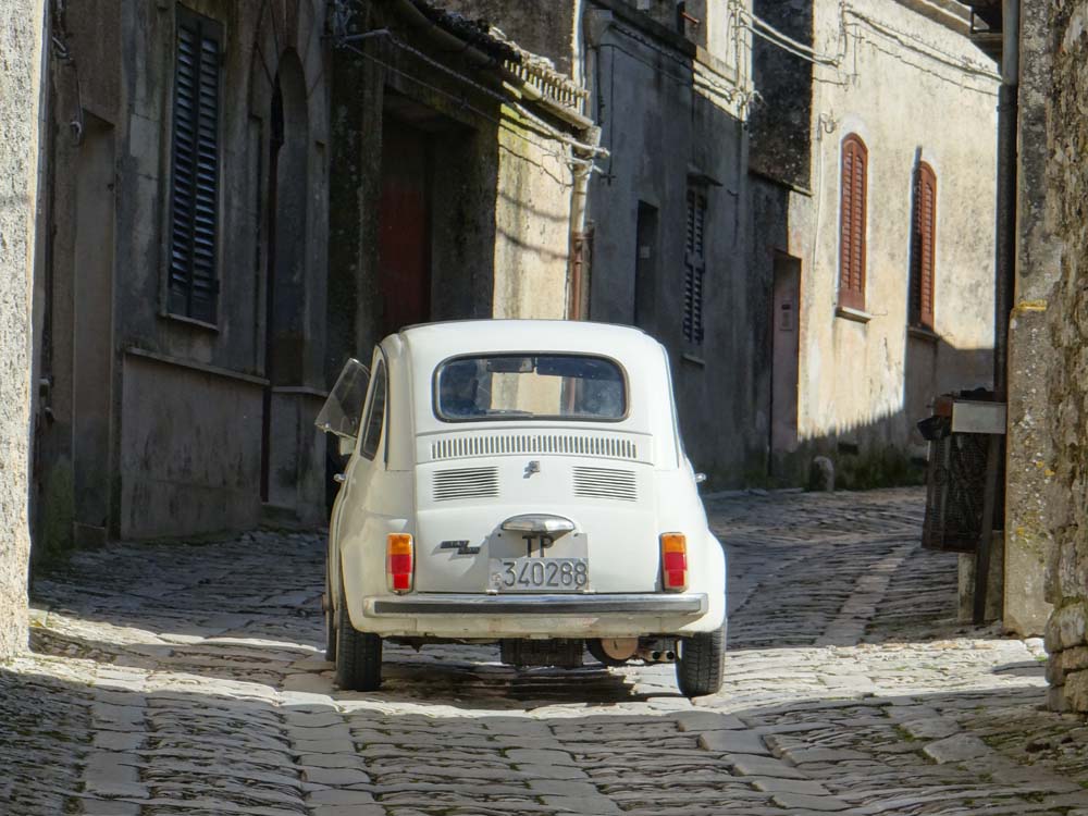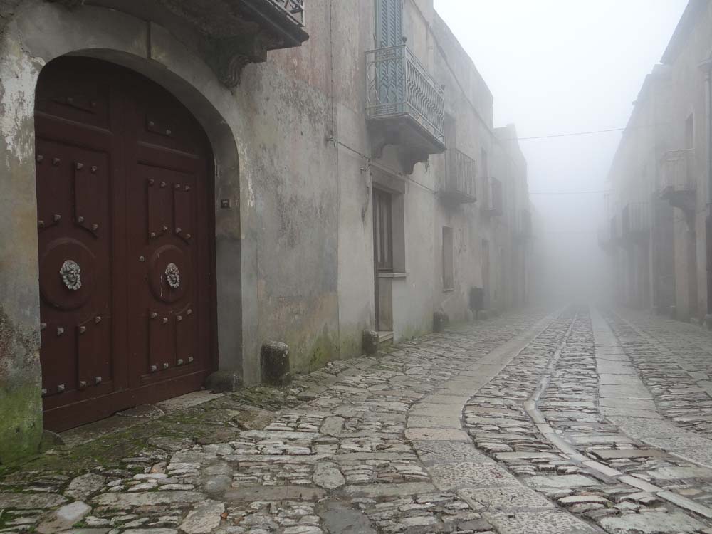 Erice’s another of Italy’s cities which seems to have stood for ever, over 2500 years, and once you’re up here you can see why; its position 750m up offers stunning 360 degree views (sometimes), and a perfect defensive position. The ancients thought it was as high as Etna. Looking at the map yesterday, the roads leading to it looked nasty, oozing perceived narrowness, tight switchbacks and sliding-backwards gradients. In truth we cruised up, our only worry the fact we couldn’t see more than a few meters as we ascended into the cloud.