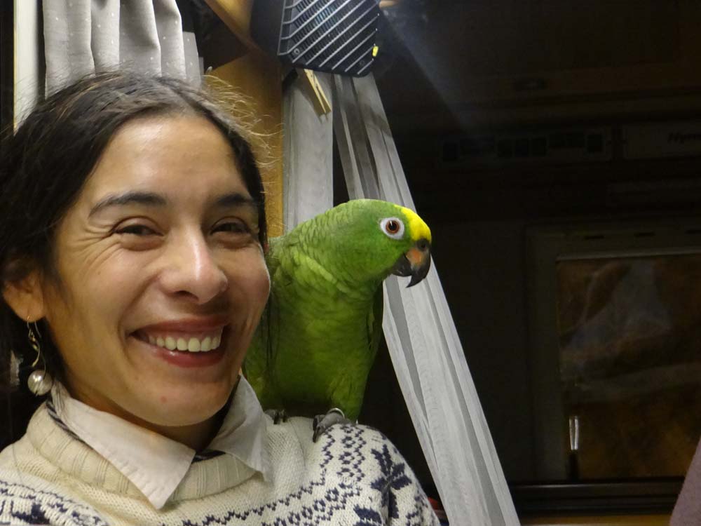 Like when you buy a car, and suddenly start to spot the same model everywhere, we spot toilets now. Public ones, where we can void Dave’s cassette and take on fresh water supplies. Ju’s eagle eyes found some we could easily access and just around the corner (where we’re parked now), wonder of wonders, a UK-registered motorhome! Hoorah! No-one was home so we fetched up Dave and started the jobs in a hurry. Pretty much straight away a couple of figures headed our way. Not to scald us for being the pikies we are, but to introduce themselves, Joyce and Alastair and, huh? eh? what the? Ozzie, a green parrot, stood corsair-like on Alastair’s shoulder, completely disinterested in our loo.
