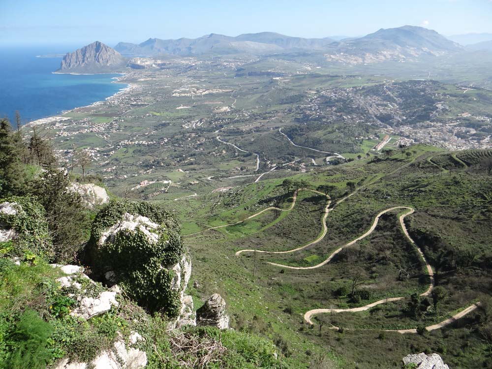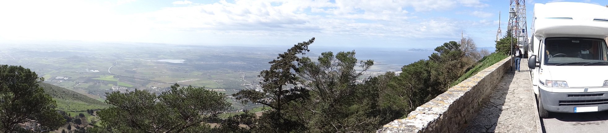 Dave the motorhome has a bird’s eye view of of the north west coast of Sicily, parked on the edge of a cliff (N38.03582 E12.58375) in the mountain-top town of Erice (which, as far as we can tell, is pronounced ‘ay-reech-ee’). He’s not, strictly speaking, parked legally just here, passing a no-motorhomes sign to reach this perch, but no-one is interested in us and there is an official area for us to park if we need to move, a few hundred meters down the mountain. Also, the view I mentioned appears and disappears with the hours. At the moment we can see nothing below us, looking down into an abyss of grey-white cloud. No, wait, they’re clearing and the oblong salt flats south of Trapani are slowly melting back into view.