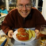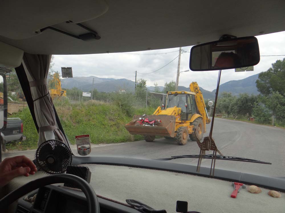 Finally, just as my trademark back-stabbing pain threatened to make an appearance, the road levelled out and we rolled into Sparti. A fuel station advertising diesel at €1.31 a litre (it’s usually about €1.40) saw Dave’s wheels near-squeal their way into the forecourt. As the filler-upper man topped us up, using the hose from the opposite side of the pump, a chap on a moped shouted out the amounts so he could charge us a round amount. Laughing at the way he went all auctioneer-like at the end few cents, he asked where we were from, going on to say he was American. In what sounded like Greek being spoken with a US accent he lamented at how he’d moved from Washington ten years ago, had built a house here and now regretted it. ‘The dollar was good, the drachma was good, now the euro, no good’. He’d been a painter and had fallen ill within a couple of years of arriving. ‘I have kids in the States, I just want to go and visit there again’. He then oddly started to fend off filler-upper man, clearly well known to each other, calling him a malakas.