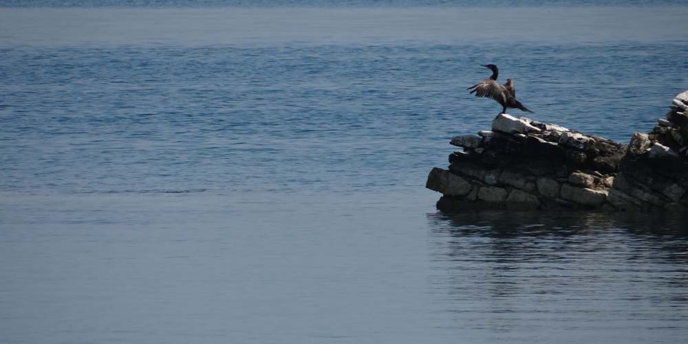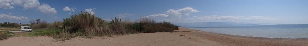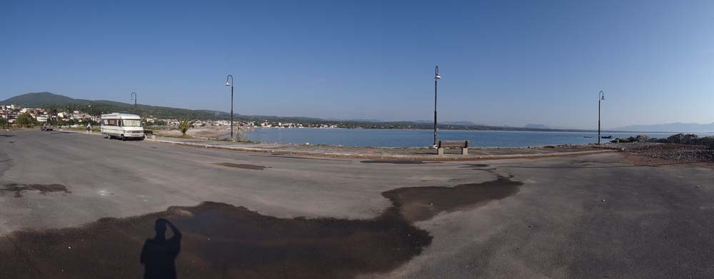 Yesterday an unusual sight drove past the back of Dave, a Greek-registered motorhome, the first we’ve seen, anywhere. Adorned with a web address, we checked it out. The Camper Club of Greece is, it turned out, a motorhome hire company. If you fancy a motorhome tour down here without the inconvenience of buying/transporting your own vehicle, it looks like a great solution (if a bit pricey – €120 to €230 per day). The hired van drove past us and out onto the jetty into the sea, which looked a better spot for a quiet evening so we decamped and parked up in front of them.