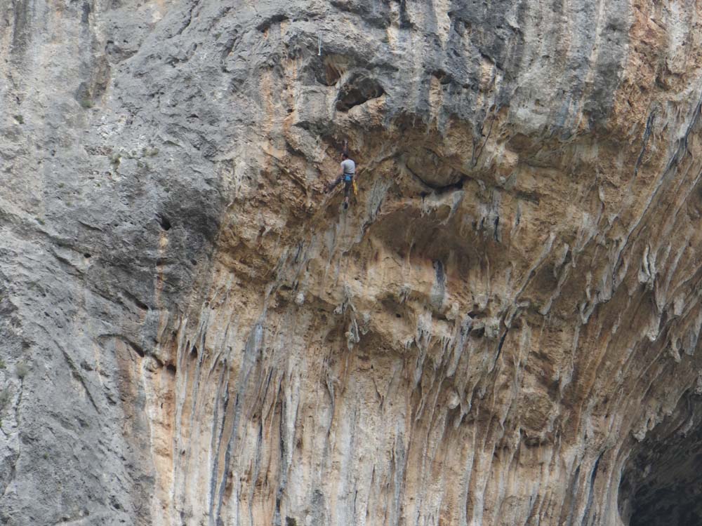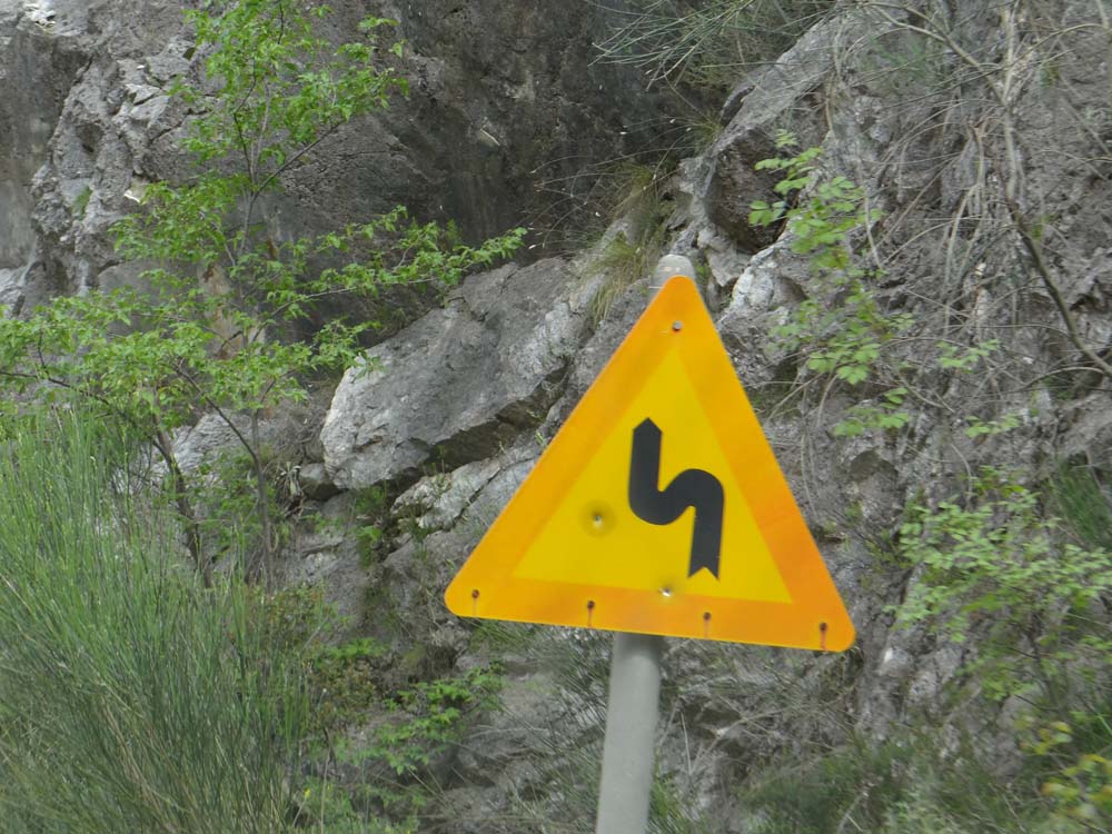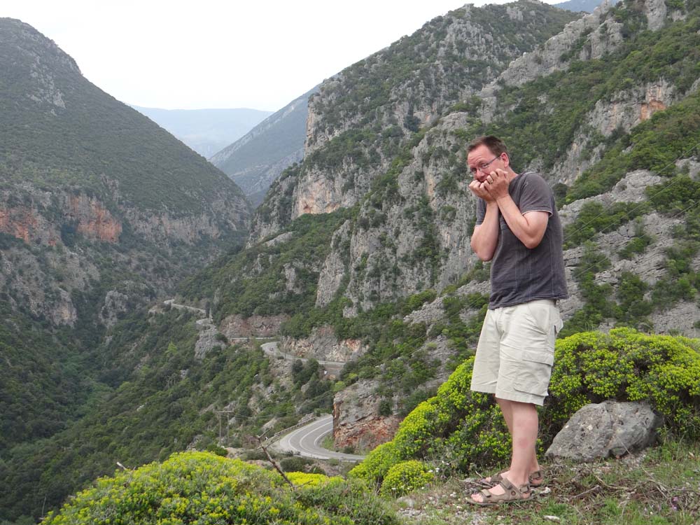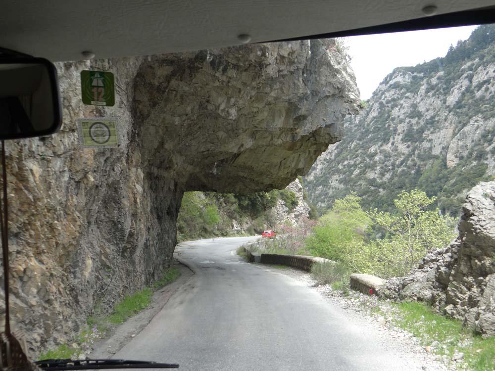 As the crossed out Kalamata sign drifted past, the road went all mountain-like on us. Narrowing down, twisting around and bumping us about, there was hardly a stretch of level, straight tarmac. Switchbacks fell away down precipitous drops as the road searched out an unlikely path over the crumpled countryside. Overhanging cliffs suddenly appeared without warning, thankfully we easily passed beneath them. For anyone with a hint of acrophobia, this ain’t the path for you, or come blind-folded, or drunk. Having said all that, the French chap we’d camped near at Koroni passed us going the other way, and he had a HUGE van, a luxury beast with hydraulic levelling legs, and he’d clearly made it OK. Although he was an airline pilot thinking about it. We had a laugh wondering if he can’t help himself give a commentary as he drives: ‘Ladies and Gentlemen, this is your captain speaking, we are cruising at an altitude of no feet, with an airspeed of 43 miles an hour. The weather in our destination is a balmy 23 degrees, and we are scheduled to arrive in <checks sat nav>, 25 minutes’.