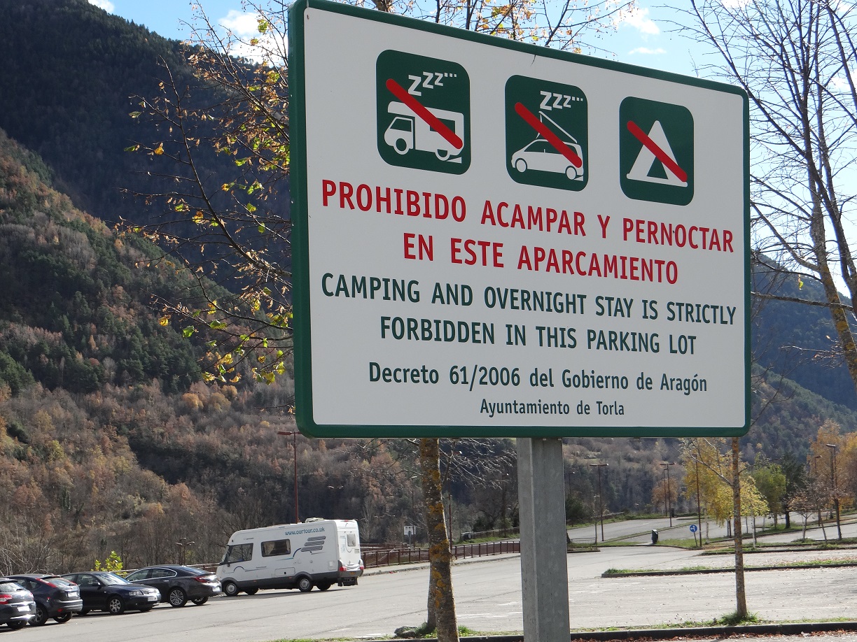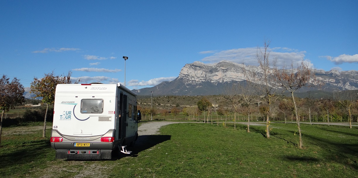 Zagan the motorhome is relieved he has both his sides intact. The yellow-classification roads here in the Spanish Pyrenees are wider than the white ones, but only just, and we’ve squinted our way through 2 hours of ’em today. After a failed attempt to park deep in the mountains, he’s in a cracking free (out of season) car park alongside the medieval village of Aínsa (N42.41859 E0.13354).