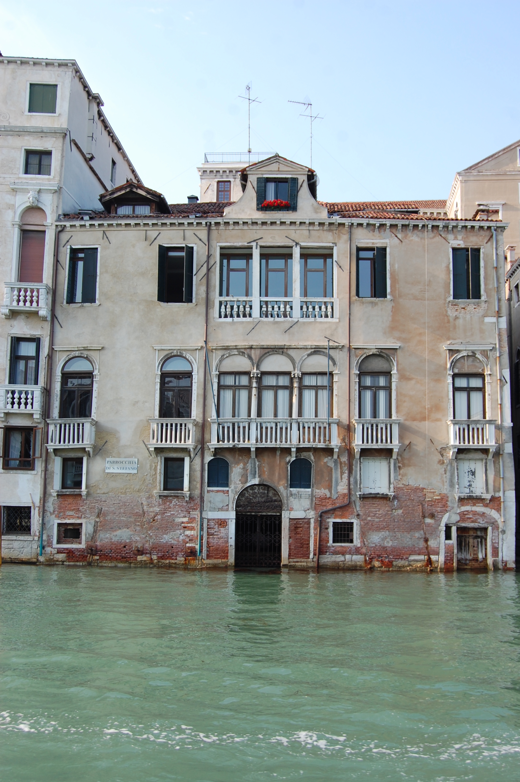 Aiming for St Marks Square (and missing by quite a bit) we spot the stop for the number one vaporetto line with a boat approaching, so we hop on. I get a seat, Charlie positions himself under it and promptly falls asleep (well he’d had a busy morning) and Jay leans out of the window above me and takes pictures. The number one stops at pretty much every stop along the Grand Canal, so we have plenty of time to take in the sights. We get off at Piazzale Roma after reading about a good viewing point there. Good, meaning free and dog friendly, finds us at the top of the car park looking out across the rooftops and canals. To our left we can see the bridge that brings the cars and trains to the city, and to our right is the land of the boat. Signs all around the car park ask you to leave your keys in your vehicle, as a man on the rooftop directs cars into the last few double parking spaces available. Back on the ground we stop under the Venice People Mover (a rope operated mono-rail type thing) where the nice planning people have lined a wide alley with fragrant flowers and benches – ideal for a snack to fuel us along.