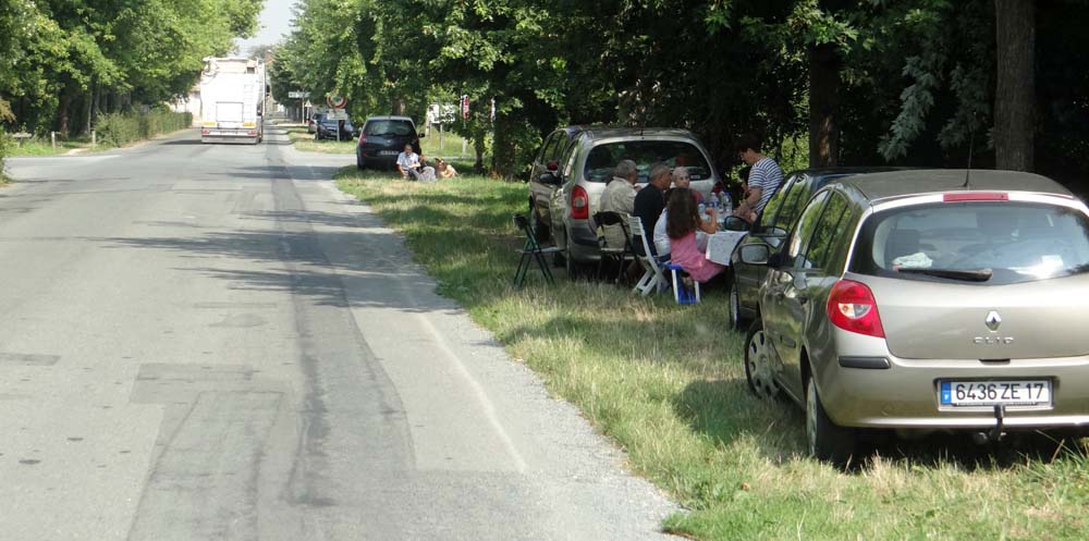 As we approached each town and village I scanned the industrial units and businesses to see if any of them might sell a Dave sized wing-mirror, but with no luck. I decided that the only thing for it was for me to become President and pass a law so that all businesses must show outside them what they are selling by way of drawings – it worked in Tunisia! We turned off the main road and were instantly in a picnic area. Not an official picnic area, but a stretch of road with families parked up and sitting at tables eating their lunch. We’ve seen this all over France, but not to this scale, something must be going on.