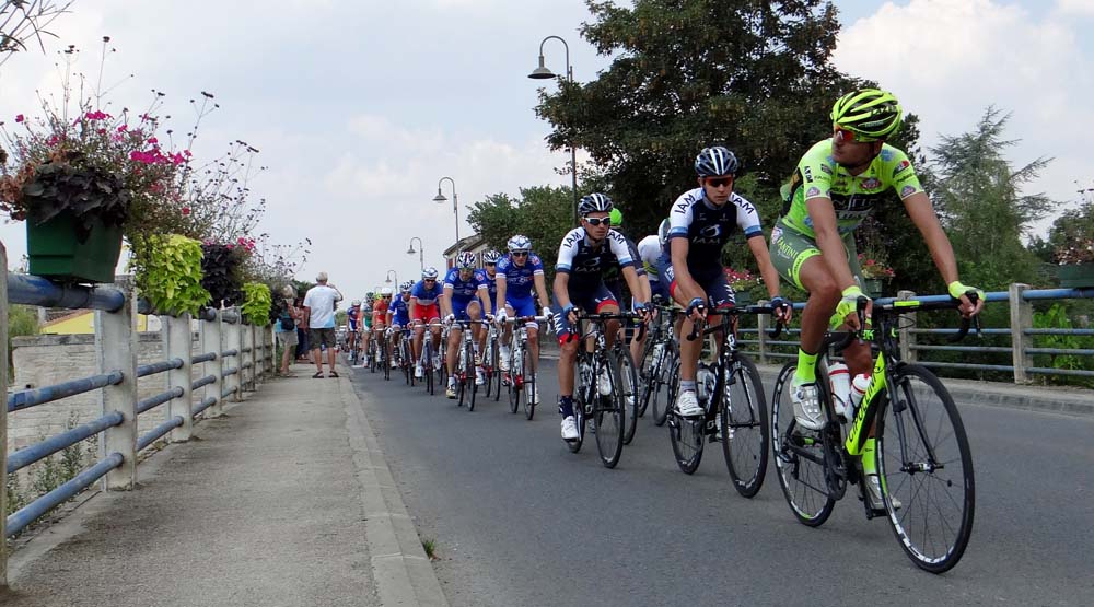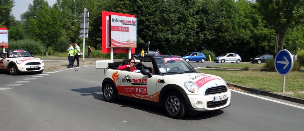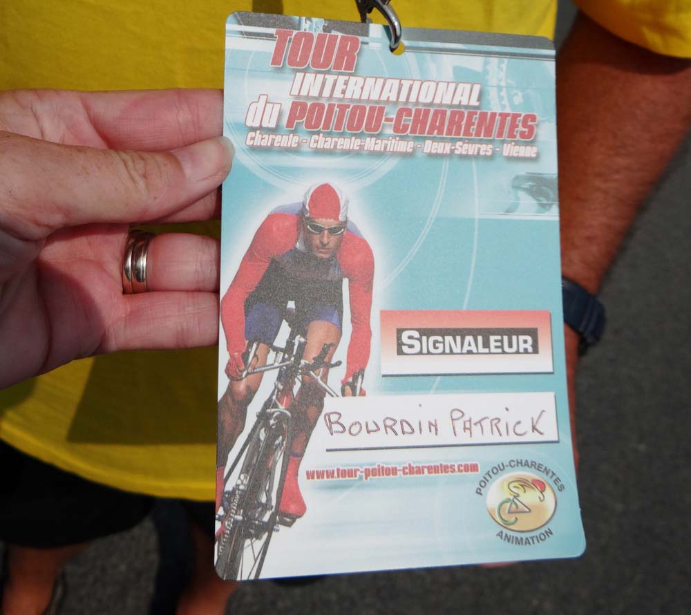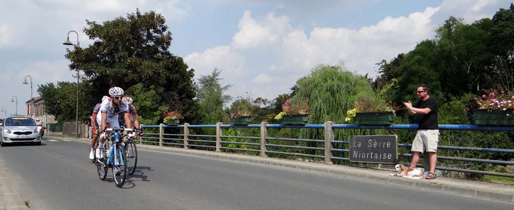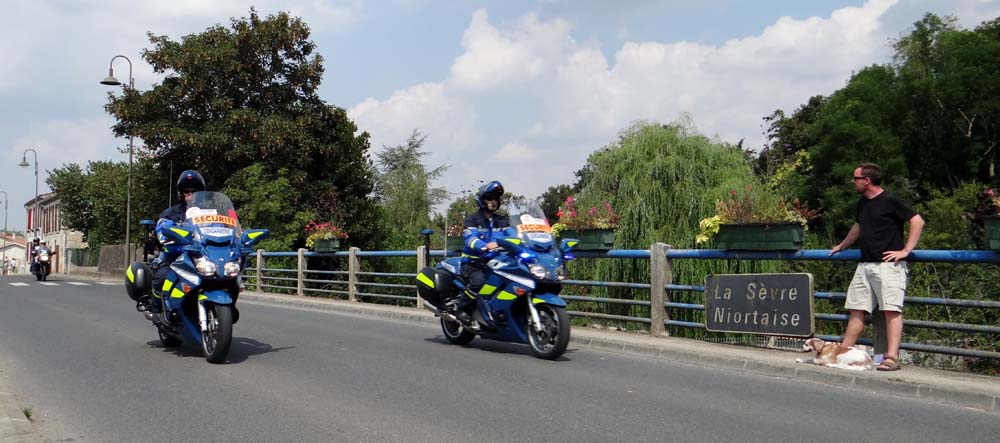 At the next roundabout three fellas in yellow t-shirts and red baseball caps were directing the traffic, the road we needed was closed. We parked up on the grass verge and walked over to see what was going on. As I looked at one of the Marshalls lanyards to see what was going on a procession of cars and vans drove past honking their horns. It was a bike race, the Tour International du Poitou-Charentes, and this was the caravan. Not the normal sort of caravan that you’d take your holidays in on the Solway Firth, but the convoy of promotional vehicles which precedes any race and throws out free stuff. Did someone say free stuff? Before the marshal’s lanyard had fallen back onto his chest I was across the roundabout and lined up for some freebies. Alas I didn’t have any children with me as all the baseball caps and balloons were going in their direction and it seemed wrong to fight them for the spoils. Within a blink of an eye the caravan had passed and the road reopened. Jay asked the marshalls when the bikes were due, but it wasn’t for another hour, so we headed back to Dave and carried on to the aire at Coulon.