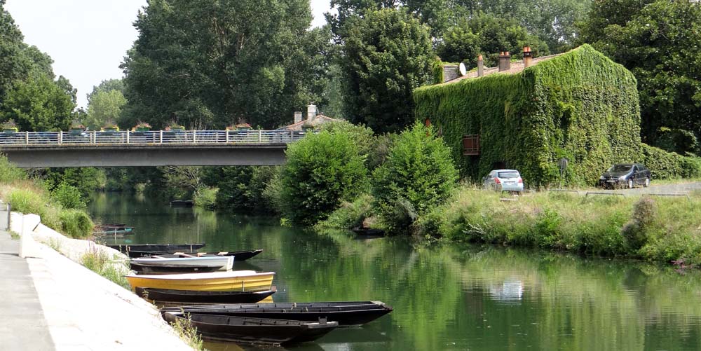 We parked Dave up and headed out for a walk. Behind the aire is a picnic area, the tree-shaded benches were alive with families consuming many a baguette. Along to the picnic area runs a stream, which is part of a huge network of streams and waterways around here which give the area the name of Green Venice. It’s so green because it’s all marsh land – even the cattle get around by boat here.