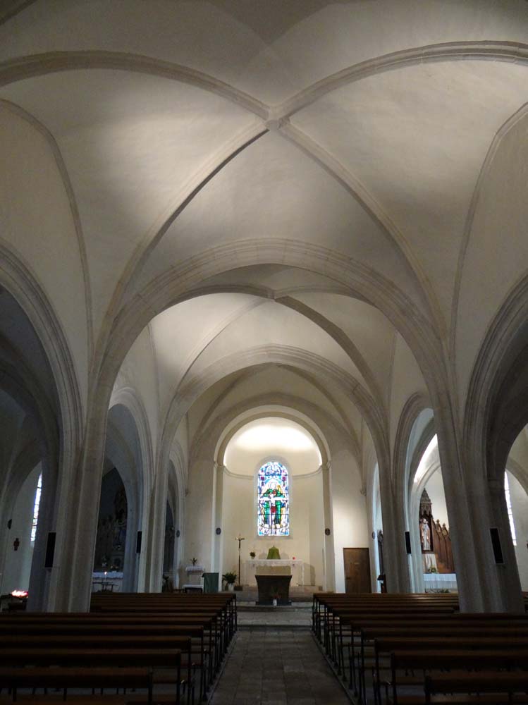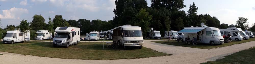 We think the aire might have moved since our All the Aires book was written as satnav was determined to guide us right into the middle of the town. After going down a street which we later spotted had a ‘camping-cars forbidden’ sign on it, we spotted a sign for parking and followed it. Just past the main car park there’s an area which you could easily mistake for a campsite. Pale yellow gravel paths divide up the green strips of grass, upon which sit about 30 shining white motorhomes. We turned in to join them and once we’d solved the riddle of the ticket machine (€7 for 24 hours, payment by card only) we were in.