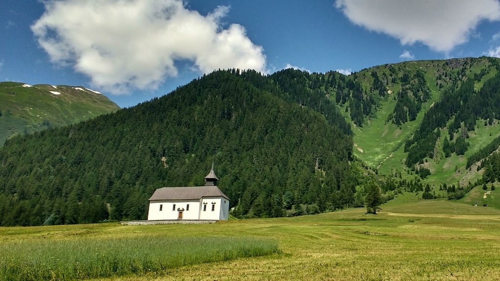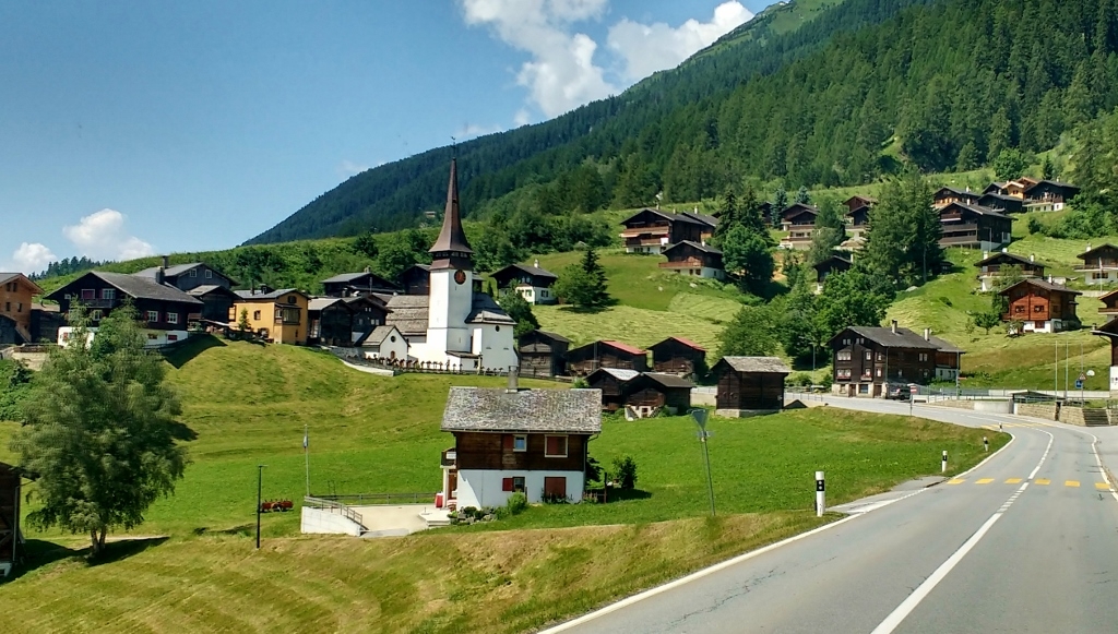We followed the river down the valley, expecting the road to widen out a bit once we were off the pass, but geography wouldn’t allow it. The river, road and railway all squeezed along together, the road making the most allowances, twisting around the other two and narrowing where needed. The route took us through postcard perfect villages of wooden houses, window boxes awash with flowers.
