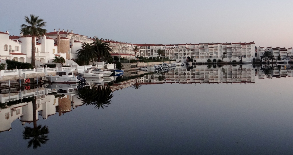Last night the sun went down over Empuriabrava turning the canals into mirrors, reflecting the empty apartments and battened-down boats. We both slept like logs in the peace and quiet of our free parking place, the view out of Zagan’s windows would command a premium at any campsite.