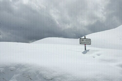 The road up until this point was wide enough for two cars. The surface was OK, a bit roughened by snow chains, rock falls and endless freezes and thaws, but an easy drive. Passing La Foux, we were on the last ascent to the col. Although the road became smoother, it also became decidedly more testing. Suddenly there was a meter of snow on the higher side, and a barrierless drop on the low side. The tarmac strip seemed just wide enough for Dave, but we did manage to creep past an oncoming car, subconsciously leaning up hill as we edged along. We later discovered this is one of the highest paved roads in Europe, and being off a main tourist route, barriers were presumably deemed too costly.