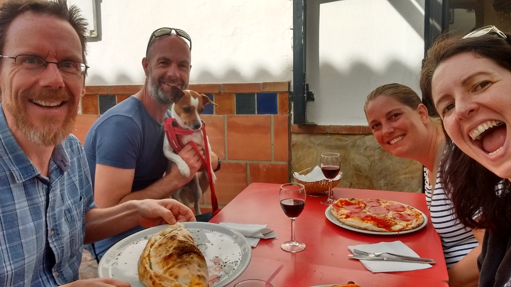 - It’s really inexpensive compared with UK prices. We ate out yesterday with fellow motorhomers Stuart and Cynthia with their Jack Russel Luna, authors of the flipflopsandwoollyhats.com blog, just (just) managing to finish enormous pizzas at a restaurant which charged all of €4.50 each. In the evening we met up with digital nomad and father of three Andy (also known as Nomadic Dad), supping three drinks in a bar for a total tab of €5. It’s pretty cheap living down here.