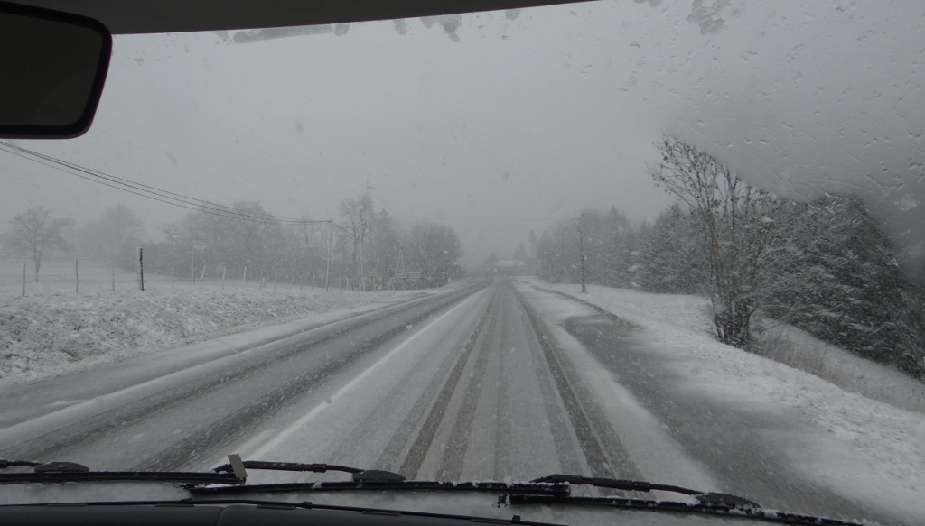 Pushing on Rose! We’ve not got winters on Zagan. Michelin sell them as ‘summer’ tyres, although they are Mud and Snow marked, so we can expect a bit more grip than normal tyres, but nothing like proper winters. Looking at the road behind us, it’s now completely clear as though nothing happened! The plough was up and down a fair bit, and it stopped snowing at about 7pm. Time for breakie then we’re off for a snowy wander. Cheers! Jay