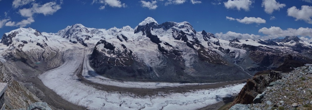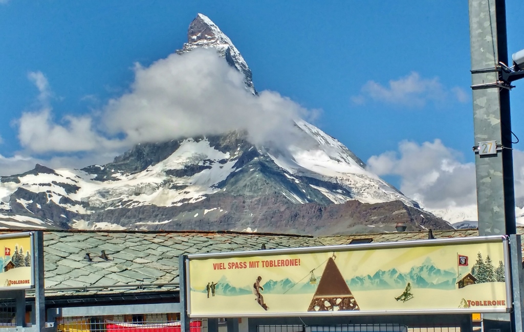 Jules and I watched the start of the race and cheered on Jay and Phil as they headed off through the streets on the start of their 13.1 mile uphill run. Once they had gone we walked down to the Gornergrat station, skipped the queue of people waiting to buy a ticket, swiped the same ticket we had used on the previous train and waited in an airport-style departure lounge. A large clock counted down when the next train was due, and as the room filled up we took up positions near the door to the platform. Posters inform you that the right hand side is the best for a view of the Matterhorn, and so we dived into two window seats on the right as soon as we were released, which of course was after all the passengers got off the train coming in.