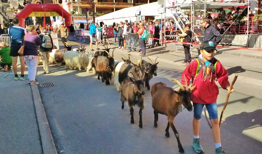 Arriving in Zermatt we’re bang in the middle of the town. Across the street is the station for the Gornergrat train, but first we had final loo stops (at the nice, clean, free loos under the station), then we navigated our way around some goats (we have no idea what is going on) before seeing the men off to their starting pens.